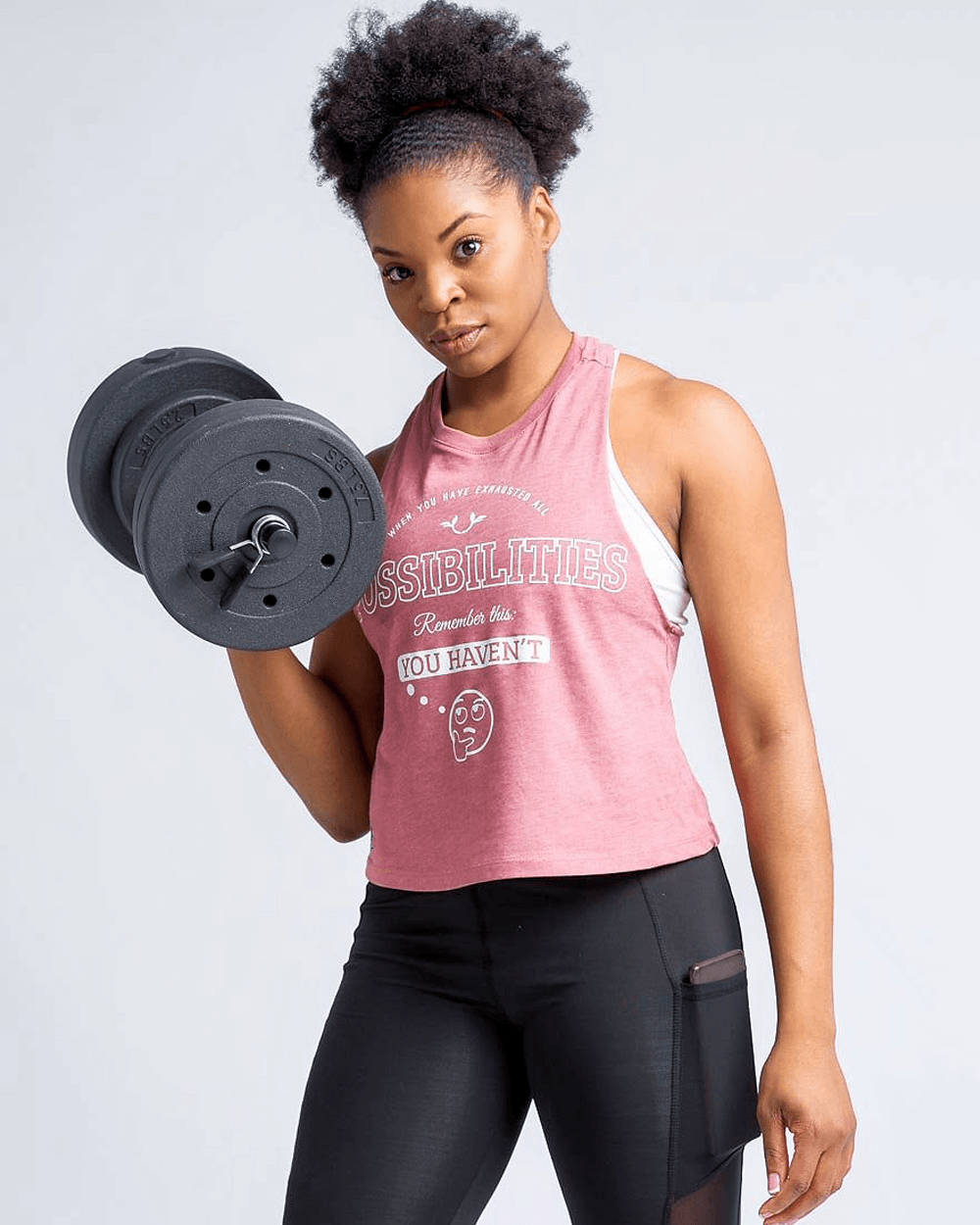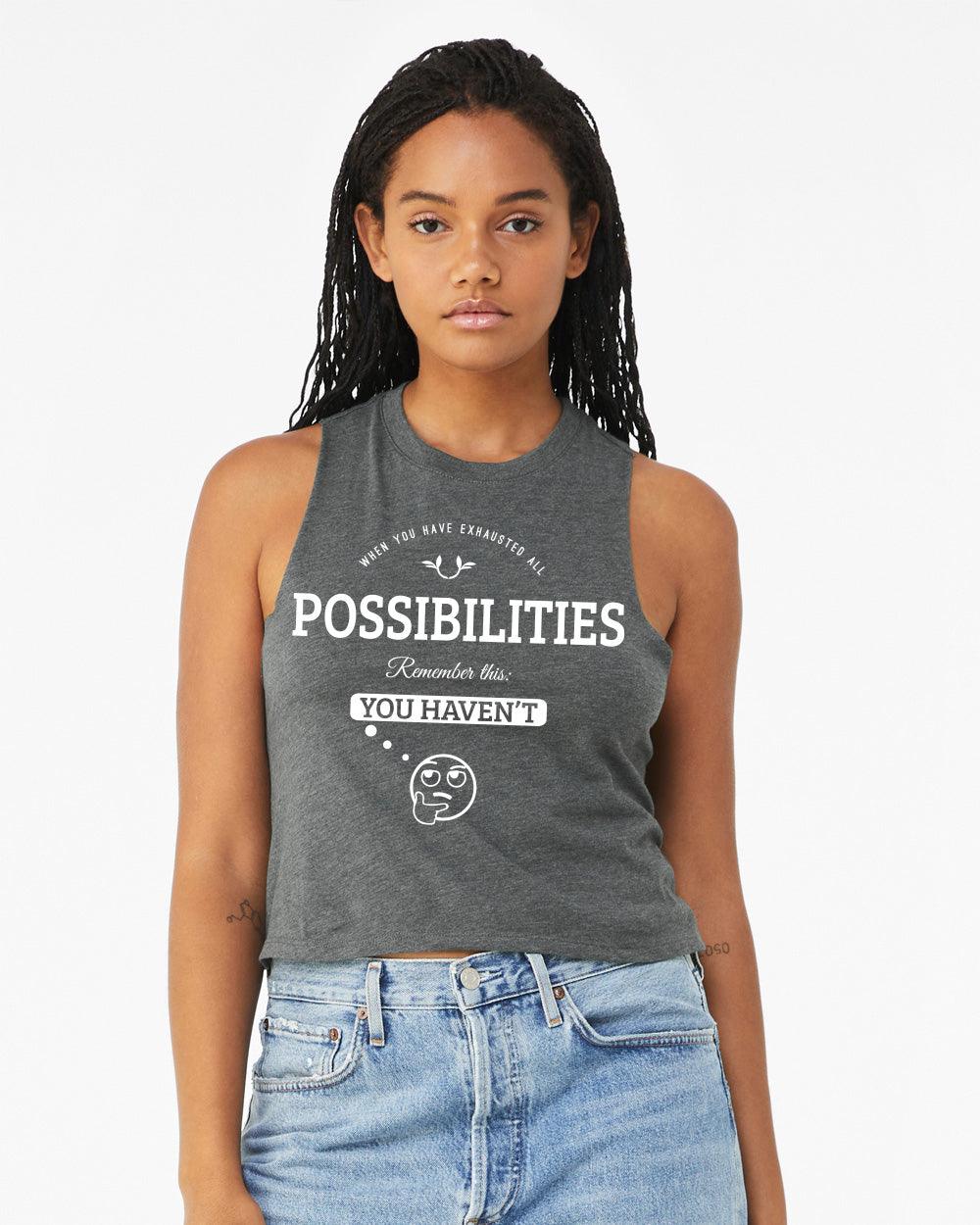 But let's talk about that empowering message. Boldly printed across the front, it's a constant reminder that there's always another option, another path, another possibility. It's the perfect tank for dreamers, doers, and anyone who refuses to give up. Whether you're hitting the gym, running errands, or just lounging at home, this cropped tank will keep you feeling cool, comfortable, and inspired. The side-seamed construction ensures a flattering fit that moves with you. This tank is designed to make every woman feel confident and unstoppable. So why wait? Add this motivational piece to your wardrobe and remember – your possibilities are endless!